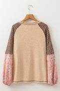 Sale Jet Stream Mixed Print Raglan Sleeve Ribbed Knit Patchwork Blouse