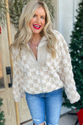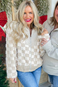 Khaki Checker Sherpa Corduroy Patchwork Zip up Collared Jacket