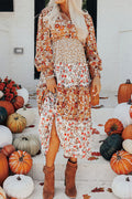 Khaki Floral Print Ruffled Tiered Long Sleeve V Neck Midi Dress