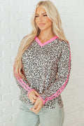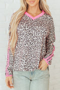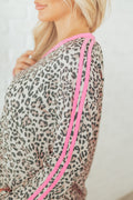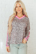 - Pink accents on the neckline and sleeves greatly highlights this leopard top.