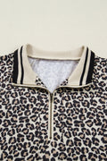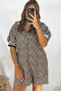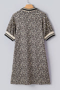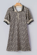 Khaki Leopard Print Zip Neck Striped Webbing Patchwork T Shirt Mini Dress