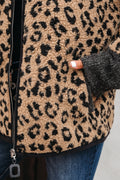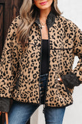 Khaki Leopard Print Zip Up Stand Neck Side Pocket Jacket