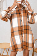 Khaki Plaid Pattern Collared Neck Ruffled Sleeve Shirt Dress