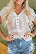 Khaki Stripe Buttoned Front V Neck Knitted T Shirt