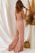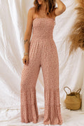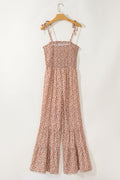 Khaki Thin Straps Smocked Bodice Wide Leg Floral Jumpsuit