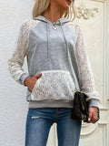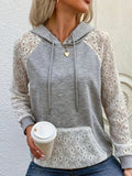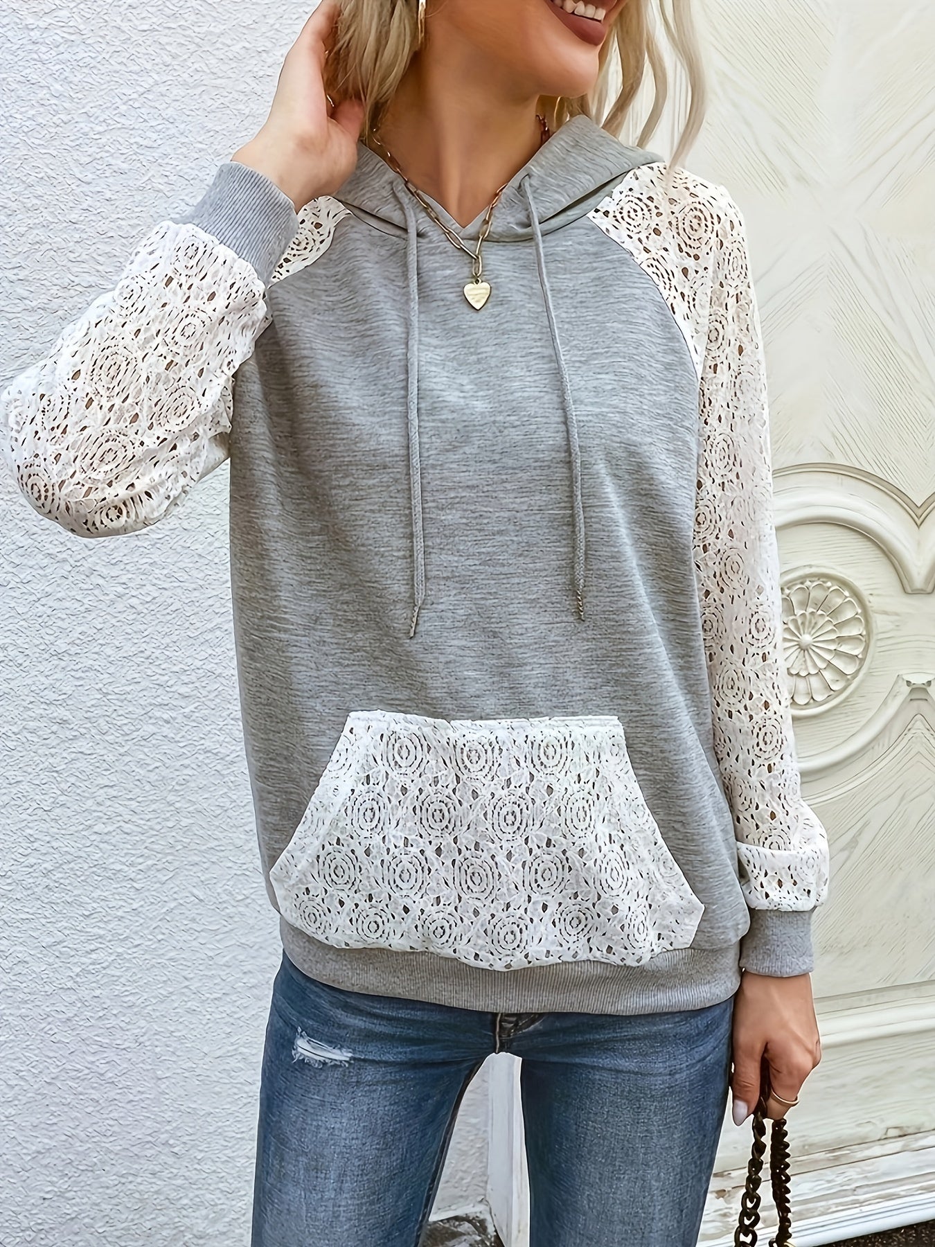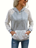 Lace Panel Kangaroo Pocket Hoodie, Casual Long Sleeve Drawstring Hoodie Sweatshirt