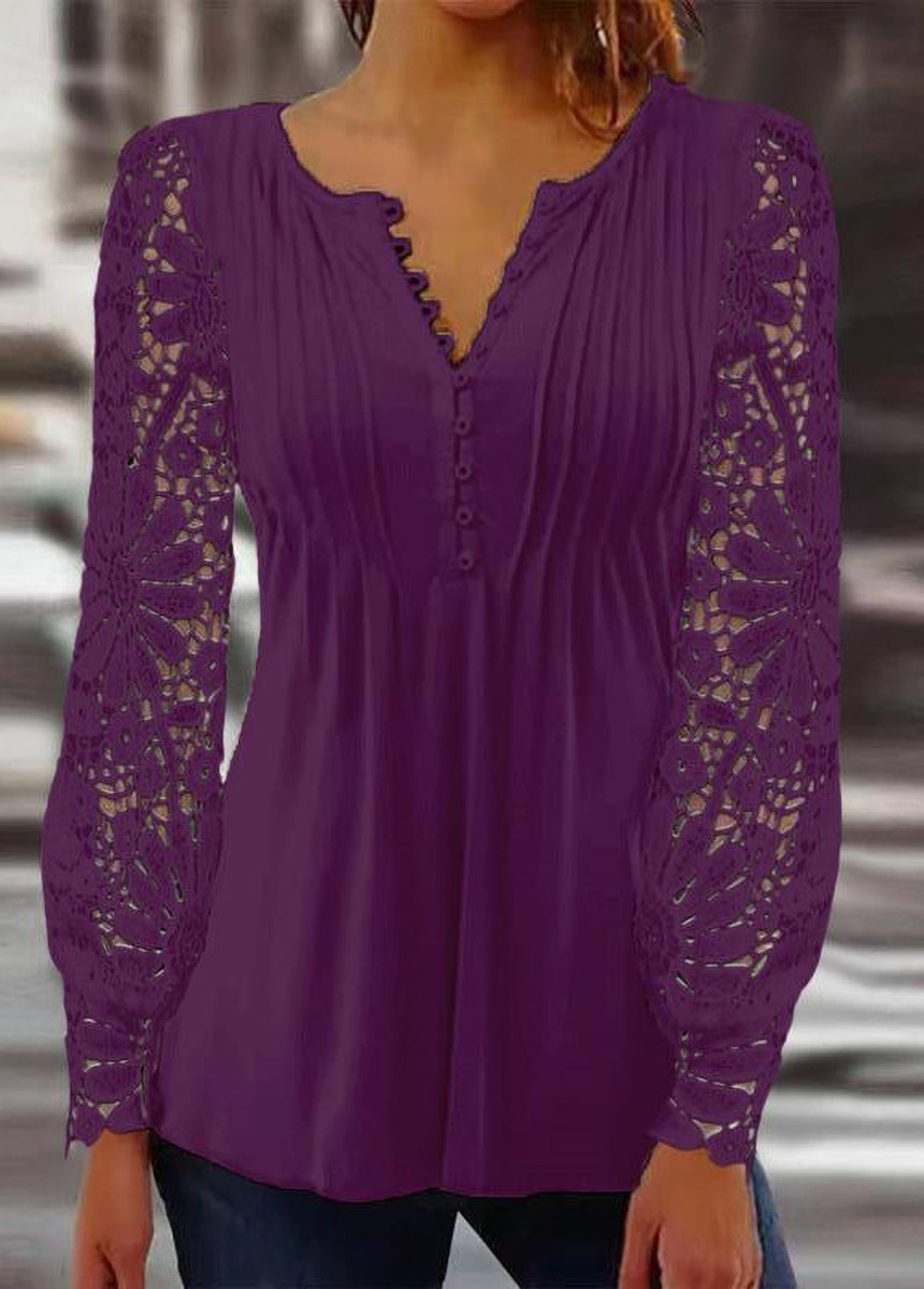 Sale Lace Trim Pleated Solid Color Long Sleeve Button-Up T-Shirt