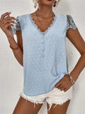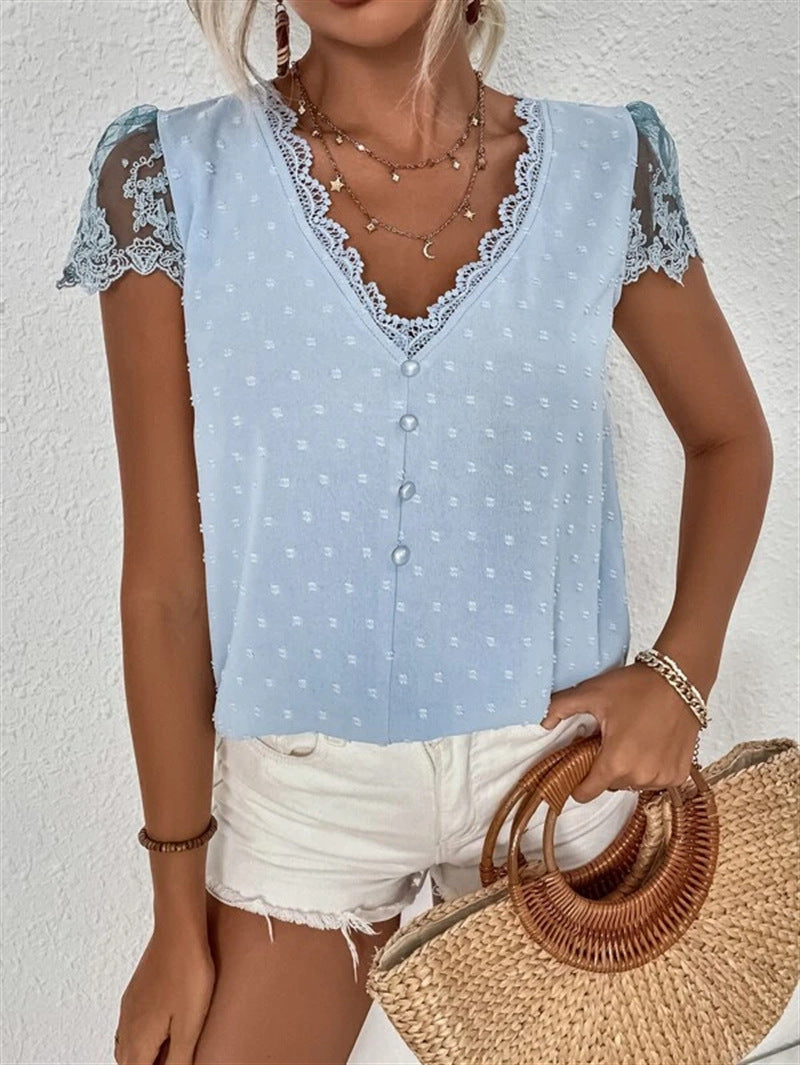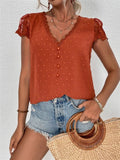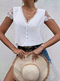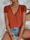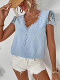 Lace V-neck Loose Blouses, Casual Button Down Lace Sleeve Fashion Shirts Tops