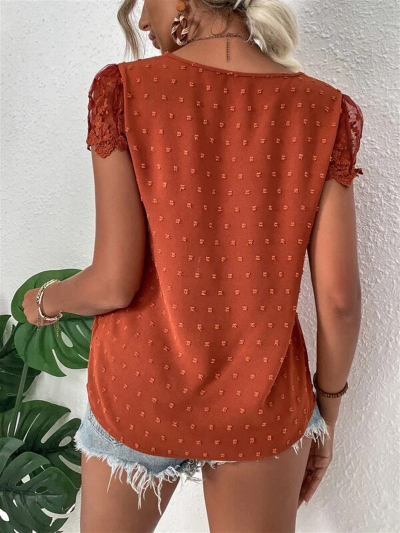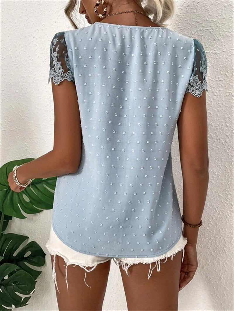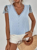Sale Lace Splicing Swiss Dot V-neck Blouse, Elegant Long Sleeve Blouse Top