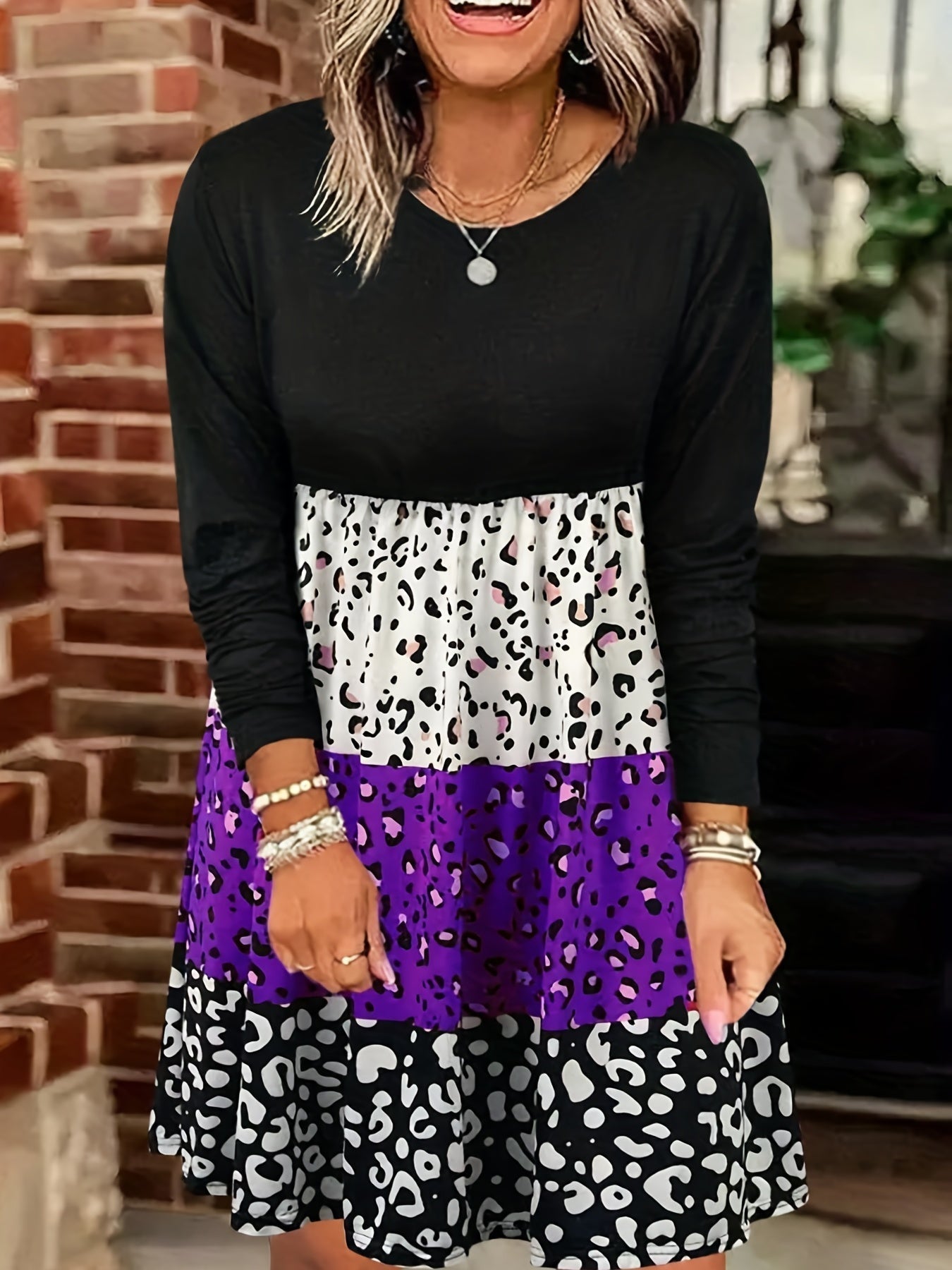 Leopard Print Color Block Dress, Casual Crew Neck Long Sleeve Dress