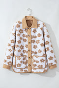 Light French Beige Cute Flower Pattern Button Up Fleece Jacket