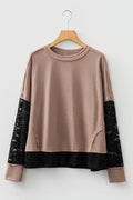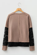 Light French Beige Sheer Lace Patchwork Casual Long Sleeve Tee