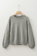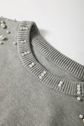 Light Grey Pearled Drop Shoulder Round Neck Sweater