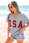 Sale Light Grey USA Lettering Patch Notched Neck Loose Tee