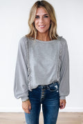 Light Grey Waffle Patchwork Long Sleeve Raw Hem Pullover Top