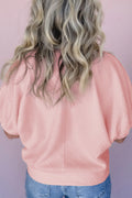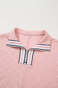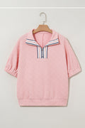 Light Pink Contrast Striped Collar Patchwork Textured Half Sleeve Blouse