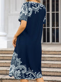 Mandala Print Short Sleeve Tucked Dress, Casual Crew Neck Dress