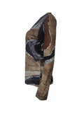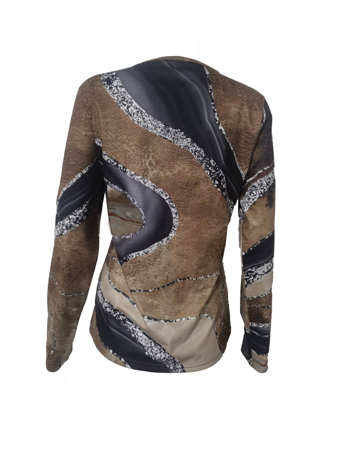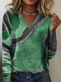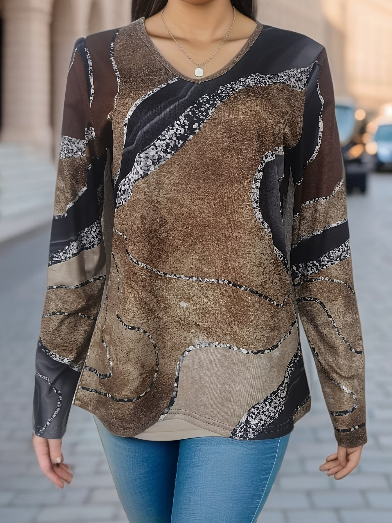Marble Print V-neck T-Shirt, Vintage Long Sleeve T-Shirt
