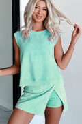 Mint Green 2 Pieces Mineral Wash Cotton Tank Top Lined Split Skirt Set
