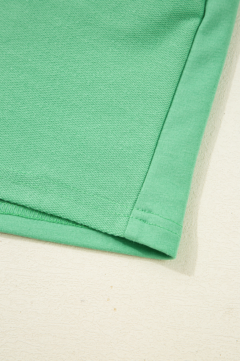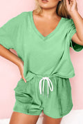 Mint Green Plus Size V Neck Tee Patched Pocket Drawstring Shorts Set