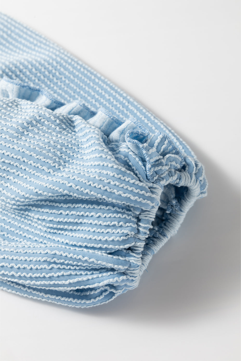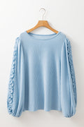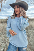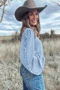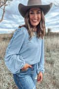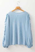 Sale Mist Blue Corded Frilly Puff Sleeve Round Neck Blouse