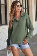 Moss Green Buttoned Collared Raw Detail High Low Baggy Sweatshirt with Slits