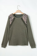 Sale Moss Green Leopard Print Crochet Patchwork Rib Textured Knit Top