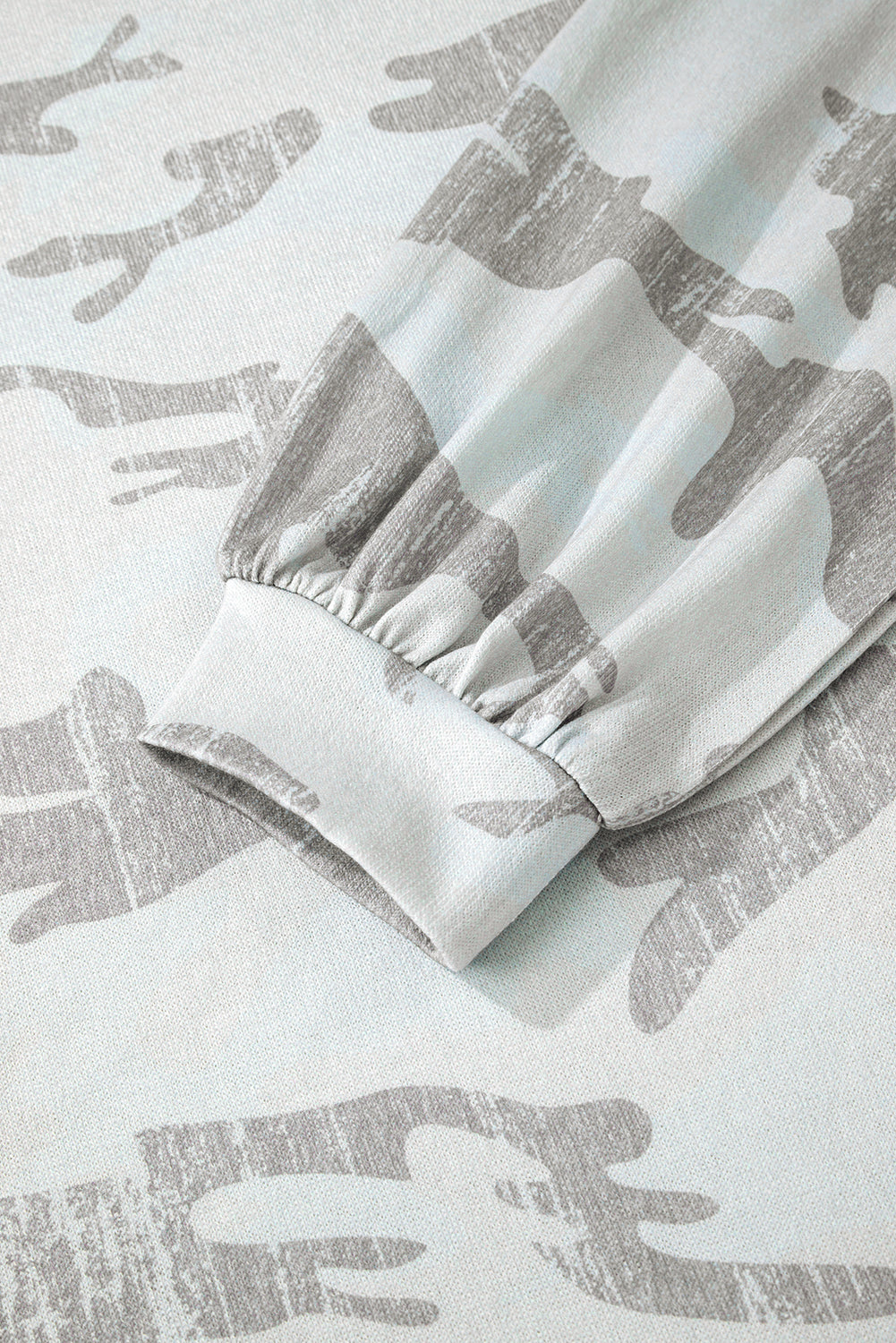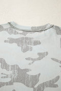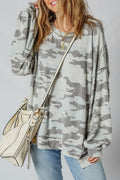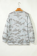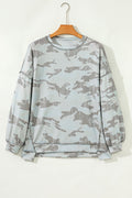 - This camouflage print sweatshirt feels like a bit retro but on trend.We love its relaxed fit style but also the drop shoulder design.The tunic length is perfect to make wearers feel slim.The uneven hem adds uniqueness and fashion sense to this camo sweat shirt.