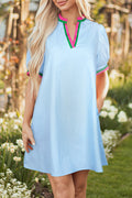 - This tunic dress features a solid color and flattering style.Contrast striped trim at neck and sleeves.The notched v neck makes it more feminine.The puff sleeves design give a graceful silhouette.
