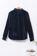 Navy Blue Frilled Neck Buttoned Front Velvet Top