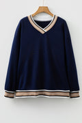 Navy Blue Varsity Contrast Striped Trim V Neck Sweatshirt