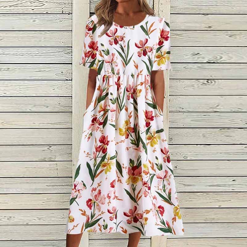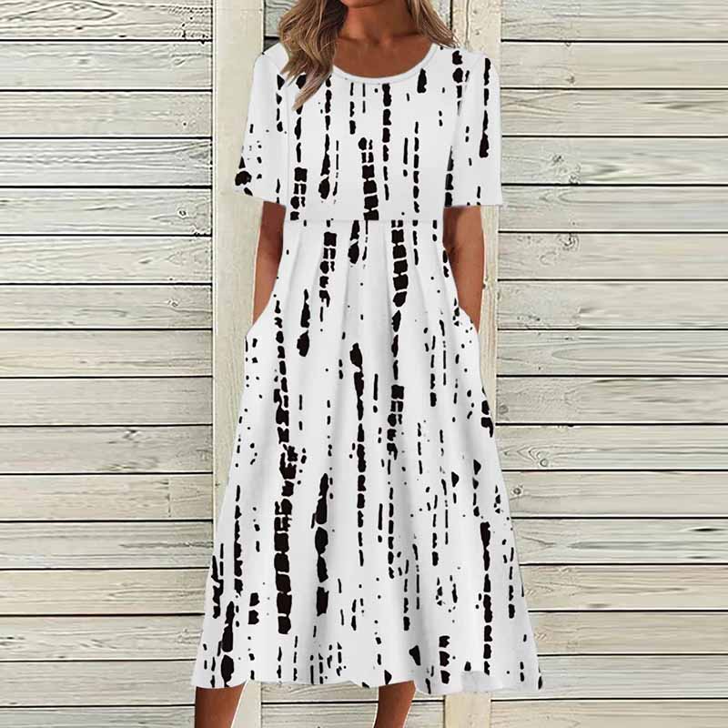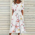 O Neck Pocket Print Short Sleeve Loose Midi Dress
