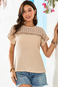 Sale Oatmeal Lace Patchwork Waffle Short Sleeve Top