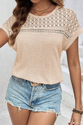 - Intricately designed lace patchwork adds a touch of elegance.Waffle texture enhances visual appeal and comfort.Short sleeves offer a versatile style for various occasions.This short sleeve top is soft and breathable for hot weather.