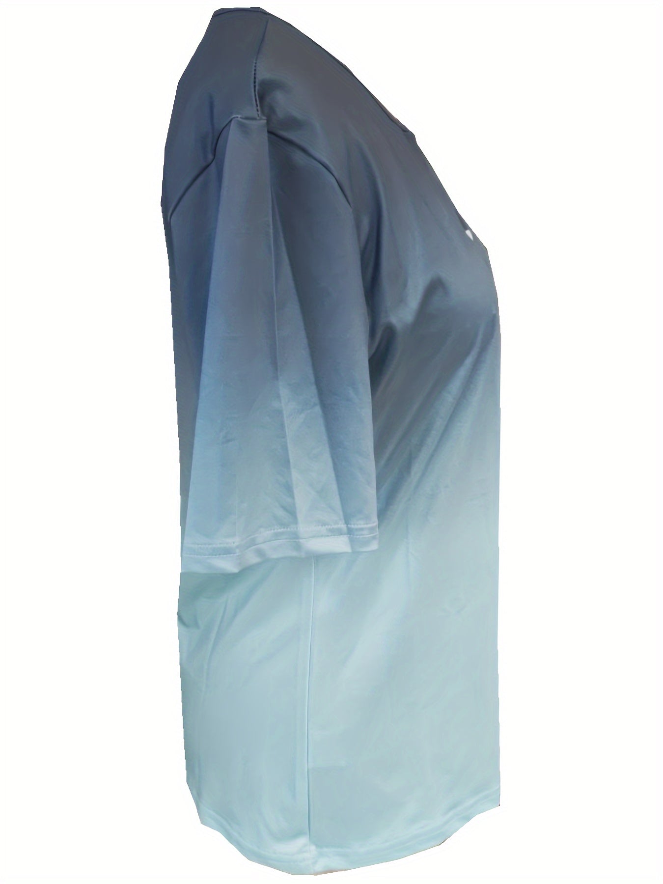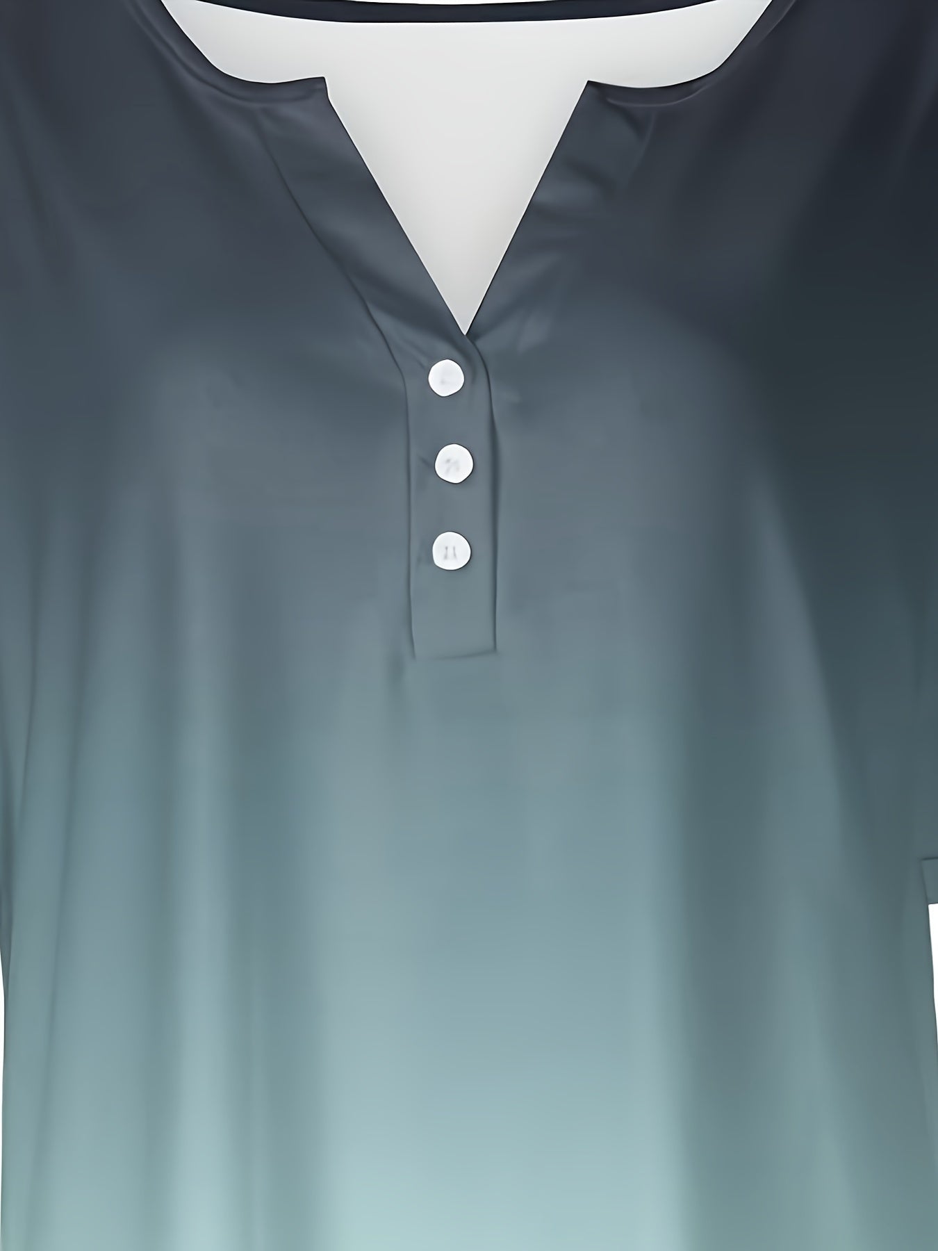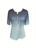 Ombre Fake Buttons Notched Neck T-shirt, Casual Short Sleeve Top