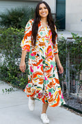 Orange Floral Print Split V Neck Tiered Maxi Dress