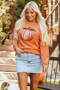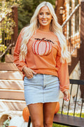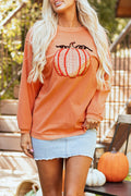 Sale Orange Sequined Pumpkin Ribbed Round Neck Halloween Sweatshirt