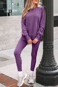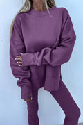 Orchid Mist Solid Color Oversize Slit Sweatshirt Ribbed Leggings 2pcs Set