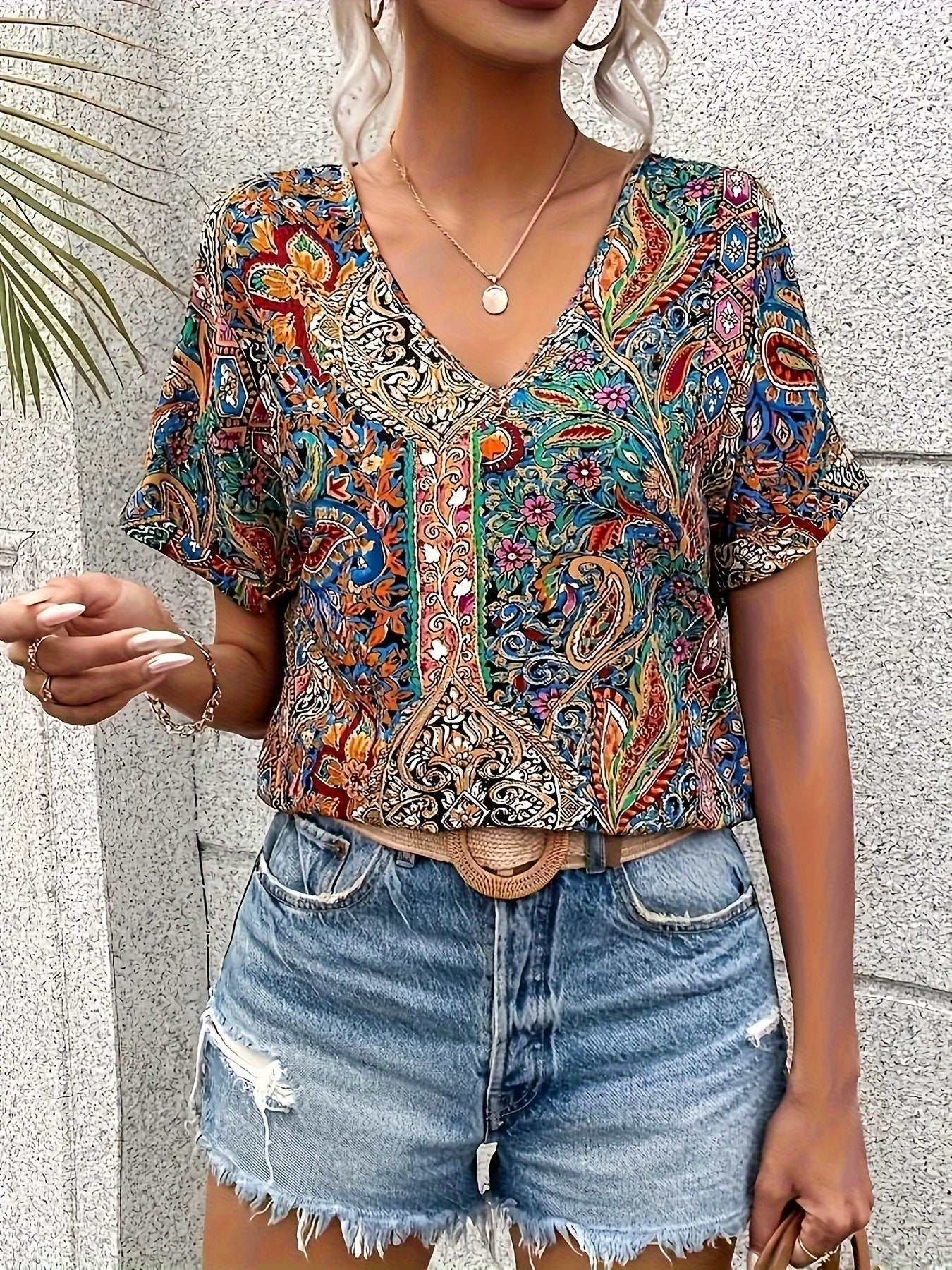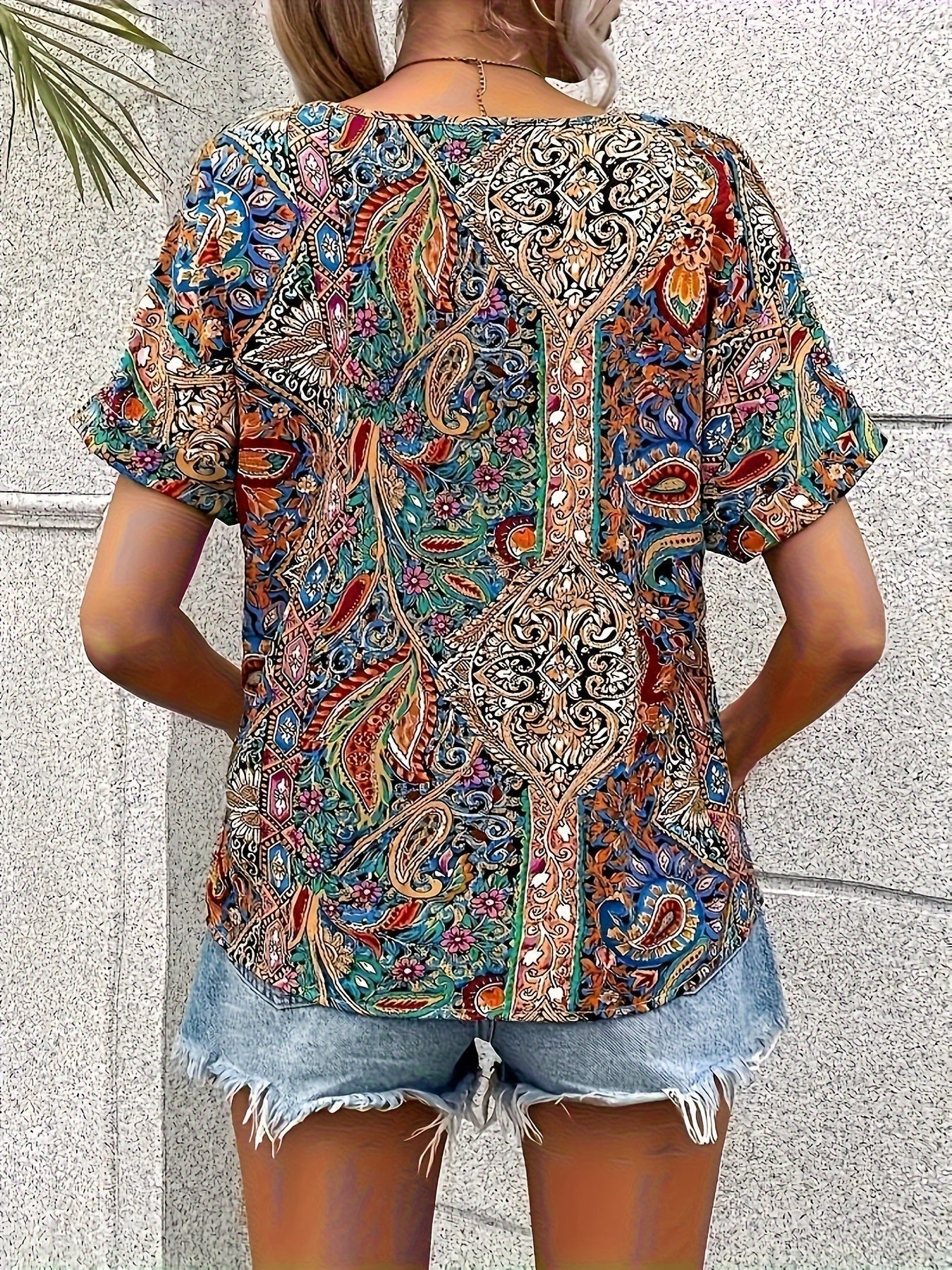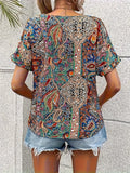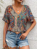 Paisley Print V Neck Blouse, Casual Short Sleeve Blouse