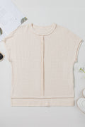 Sale Pale Khaki Solid Color Textured Seamed Short Sleeve Top