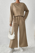 - This outfit consists of a long-sleeved top and wide-leg pants with drawstrings