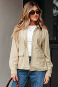 Pale Khaki Fleece Zip Up Drawstring Hooded Pocketed Jacket