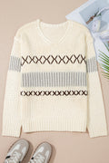 Colorful Ribbed V Neck Braided Print Long Sleeve Regular Sweatshirt