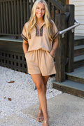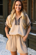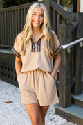 Parchment Leopard Trim Zipped Short Sleeve Casual Set