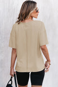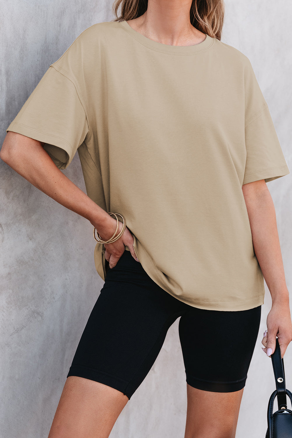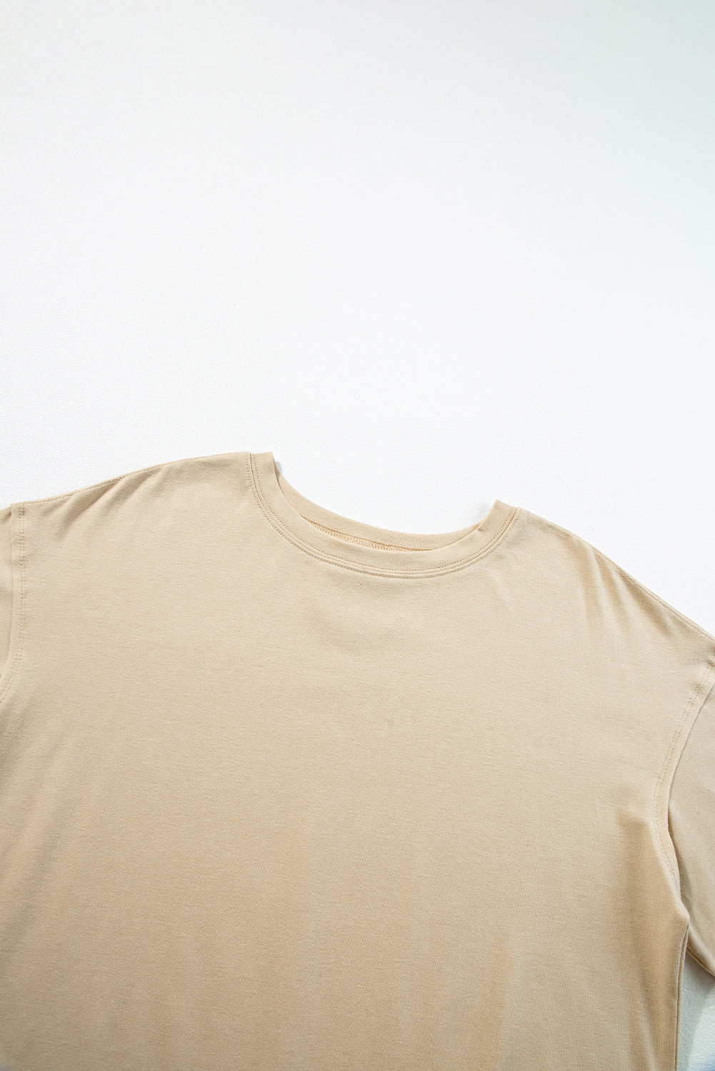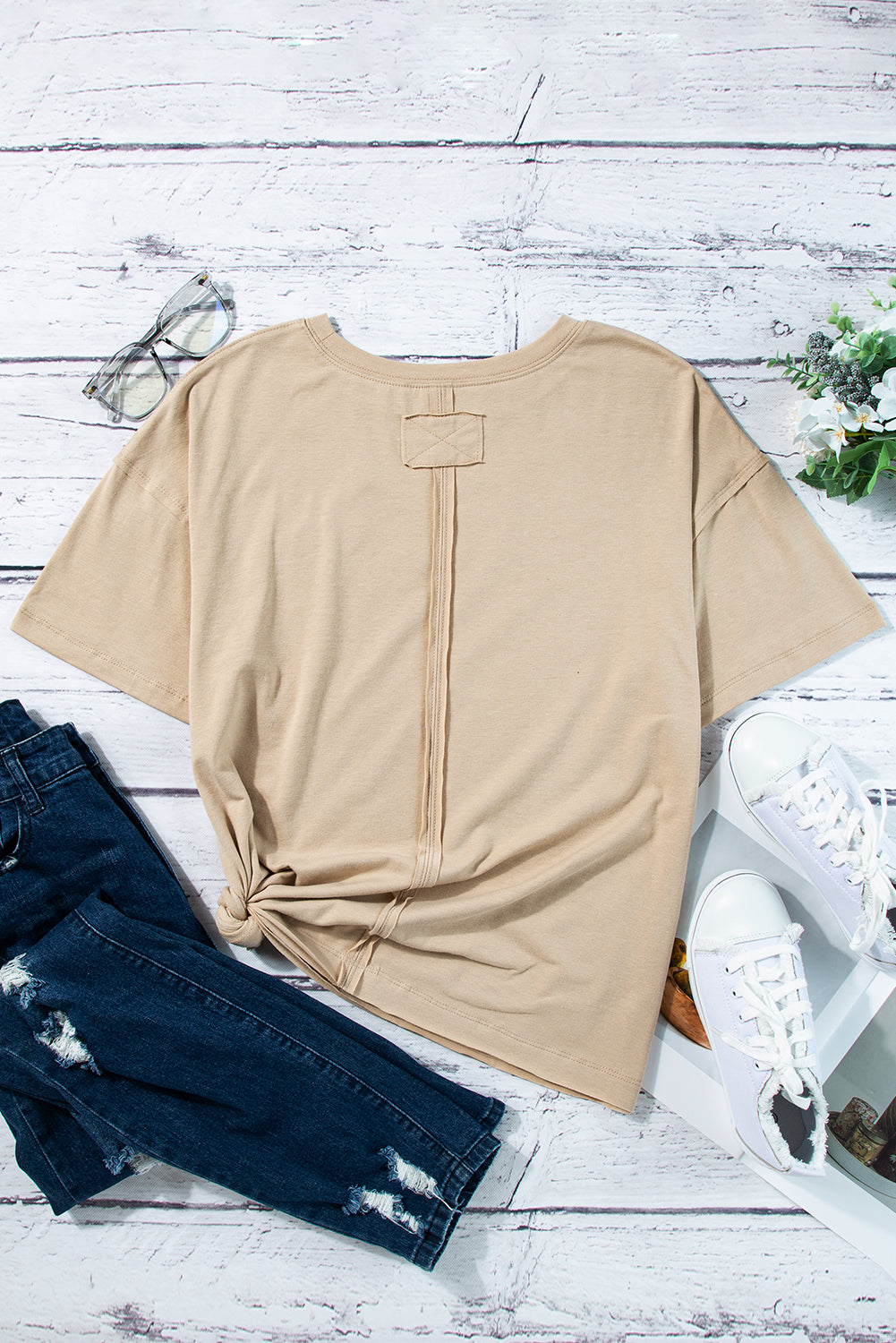 - This T-shirt features raw seams and patchwork details for a unique look.Drop shoulder design and an oversized fit provides a relaxed fit.The solid-color design is versatile enough to style with various bottoms.Perfect for pairing with denim shorts for a laid-back outfit.