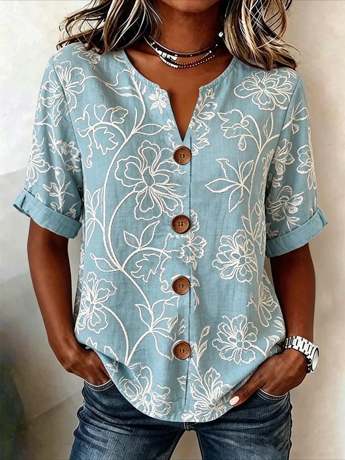 Floral V Neck Button Short Ruffle Sleeve Casual Top