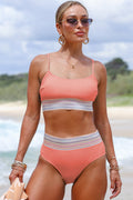 Peach Blossom Striped Patchwork Spaghetti Strap High Waist Bikini Swimsuit