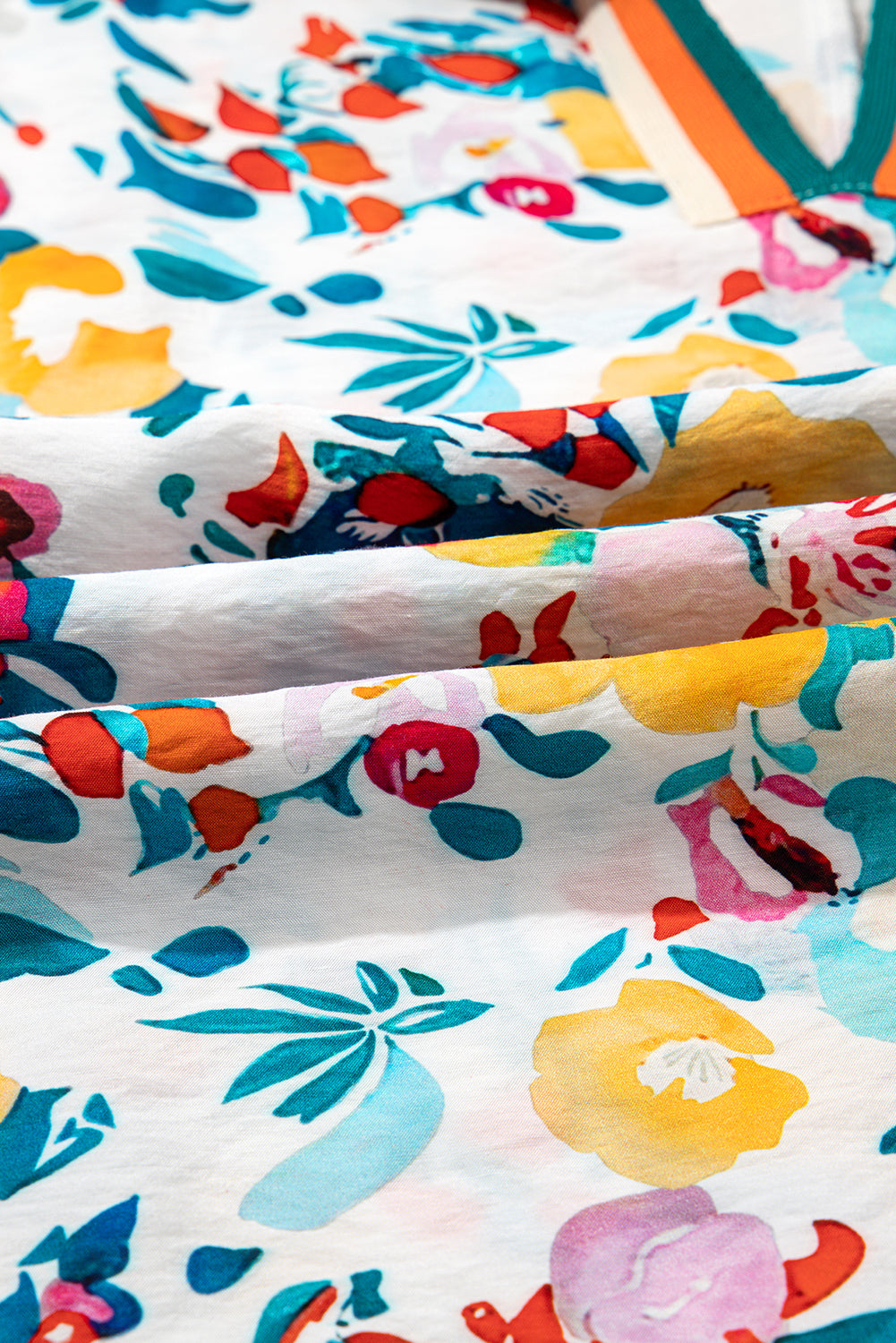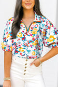 - Effortlessly feminine with a charming floral print.Stylish slit neckline adds a touch of flirty.Short puff sleeves with elastic cuffs.Perfect for both casual and dressy occasions.