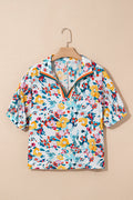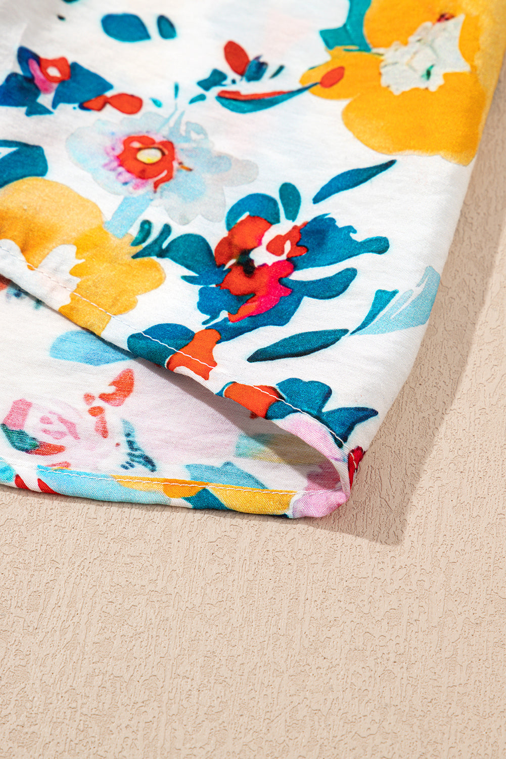 Peacock Blue Floral Print Slit V Neck Short Sleeve Blouse