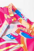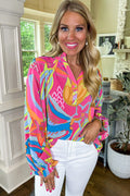Sale Pink Abstract Print Ruffled Sleeve Buttoned V Neck Blouse